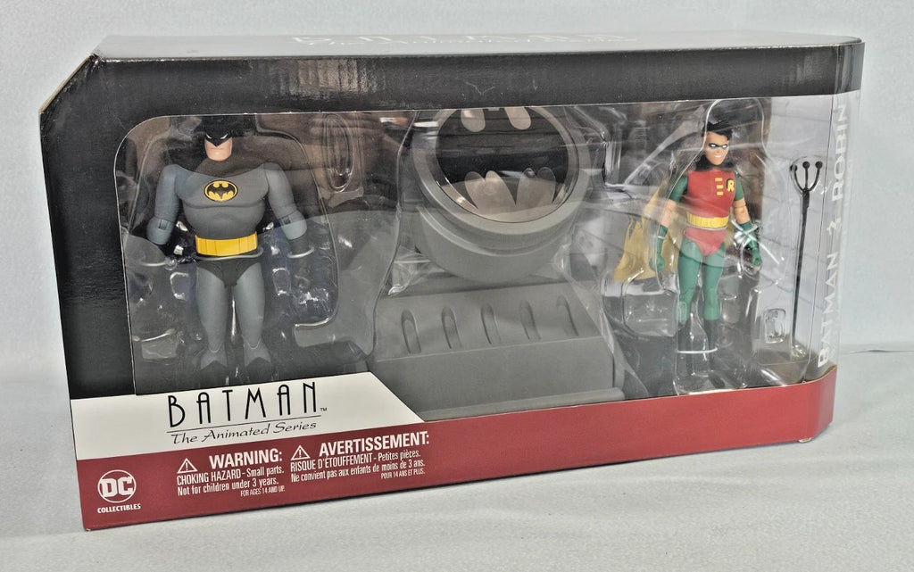 The Caped Crusader and the Boy Wonder are ready for adventure in this action figure 2-pack, which comes with a battery-powered Bat-Signal. Batteries not included. The Caped Crusader and the Boy Wonder are displayed in their Batman: The Animated Series costumes and come packaged in a window display box. Batman stands about 6 1/2-inches tall while Robin stands 6-inches tall. Requires 3 "LR44 (A76)", not included. Ages 13 and up.