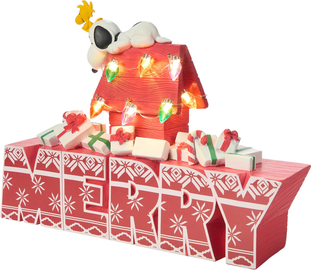 Make any space cozy with a little help from Snoopy and Woodstock! Snoopy celebrates the season as no other beagle can. He and Woodstock enjoy his doghouse decorated with Christmas lights that really light up while surrounded by perfectly wrapped packages. The word “merry” in a fair isle pattern makes any space cozy. This large scale figurine is perfect for a mantel, entryway, or any spot in need of some Christmas cheer. Fans of Snoopy and Woodstock will enjoy this festive figurine all season. It makes a thoughtful holiday present for anyone who loves the Peanuts crew and is the perfect holiday hostess gift or Secret Santa present. Measuring approximately 7.5” H, this fun figurine is carefully crafted in resin and is skillfully hand-painted. Includes 2 AAA batteries.