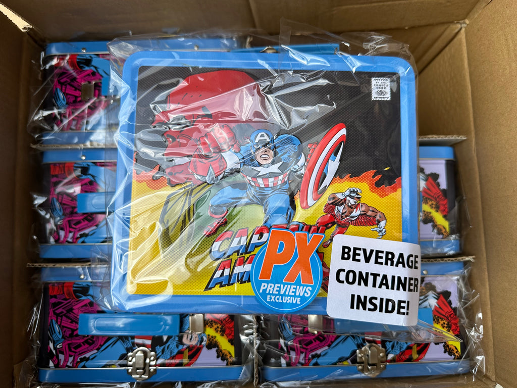 A PREVIEWS Exclusive!  your snacks are sure to stay protected in this PREVIEWS Exclusive Captain America illustrated tin tote!
