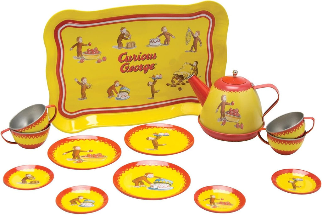 It's tea time with the world's most beloved monkey. Curious George Tin Tea Set from Schylling Toys, the world leader in traditional toys and classic fun, adds character to afternoon tea. 15 piece set includes 4 cups and saucers, 4 snack plates, a tray and teapot with lid. For over sixty years, Curious George has been climbing into hearts, capturing imaginations and endearing himself to countless children and adults around the world. For ages 3 and above.